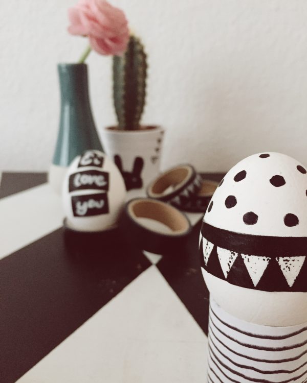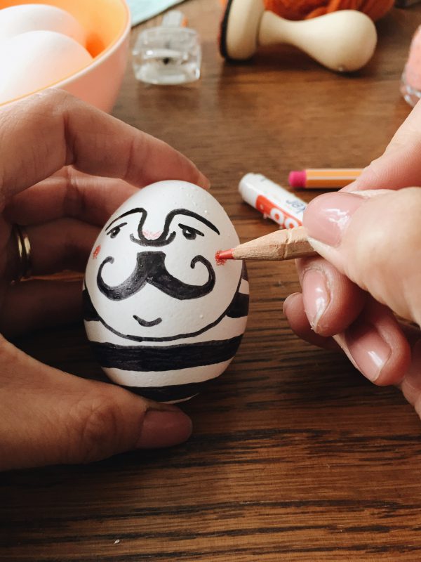 Leider ging mir die Puste schnell aus und so habe ich beschlossen (ich bin eher von der praktischeren Sorte) auf das Salmonellen-Wunschkonzert zu verzichten und die Eier einfach so zu bemalen. So wie sie sind. Auf der Packung steht, ich muss sie erst in zwei Wochen kühl lagern. Läuft also. Auf die Idee sie erst zu kochen, bin ich zu dem Zeitpunkt noch nicht gekommen. Dann wird eben aus dem „Ostereiertitschen“ eine „Rühreisause“ (schmeckt dem Jungen eh besser).