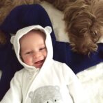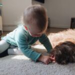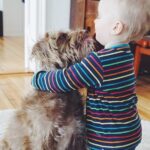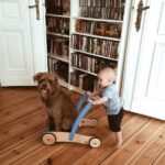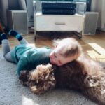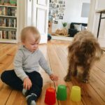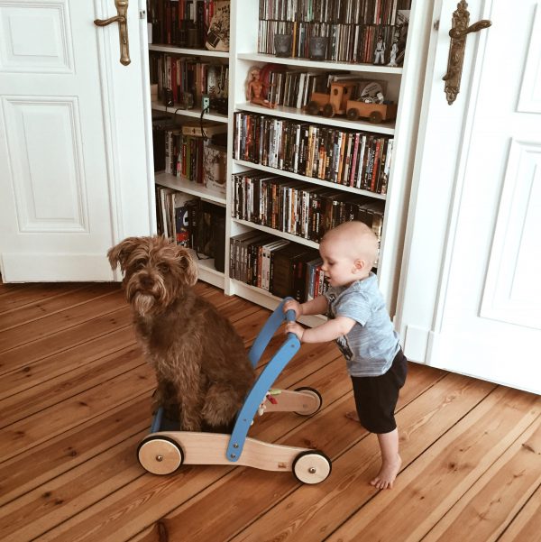 Ok, es gibt Situationen bei denen ich mir fast sicher bin, dass Junior es sich vom Hund abgeschaut hat. Er nimmt seinen Stoffball in den Mund und rennt damit quer durch das Café. Er geht draußen ins Gebüsch, um in die Windel zu machen. Ab und zu isst er ohne Hände und direkt mit dem Mund aus der Schale oder beißt beleidigt neben dem Hund ins Hundekissen. Ich glaube aber auch, dass der Hund sehr viel Positives zu Juniors Entwicklung beiträgt. Naturverbundenheit, Verantwortungsbewusstsein, respektvoller Umgang mit Lebewesen, sind nur einige davon. Die beiden sind ein großartiges Team. Die Kommandos „Sitz“, „Bleib“, „Aus“ beherrschen sie gleich gut und ich glaube auch in Sachen Krabbeln konnte sich der Minimann was vom Minihund abschauen. Der Hund hat das Kind von Anfang an respektiert, toleriert und liebevoll behandelt. Wir haben ihn nicht das Neugeborene ablecken lassen, wie man das immer wieder liest. Das kam spätestens mit der Einführung der Beikost ganz von alleine.
