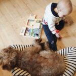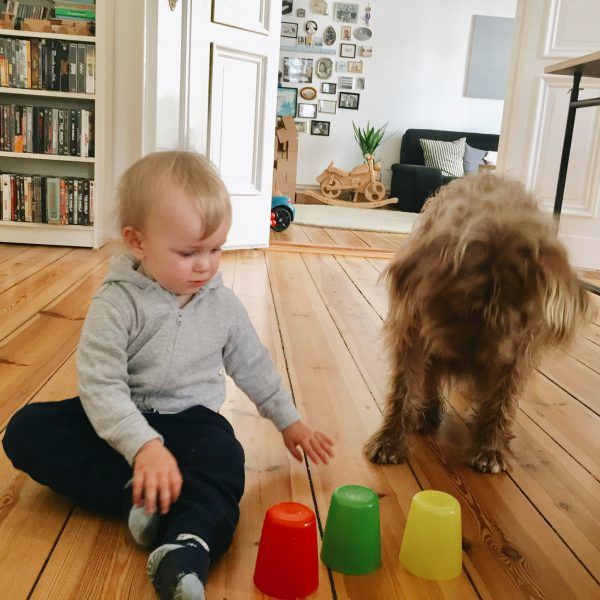Wir haben den Hund fünf Monate vor der Geburt bekommen. Der Plan war, den Hund in dieser Zeit zu erziehen, damit er dann wunderbar „funktioniert“, wenn das Kind da ist. Bei diesem Satz muss ich nach wie vor schmunzeln. Aber von Anfang an gab es feste Regeln. Kinderspielzeug ist kein Hundespielzeug. Hat geklappt, wobei sich der Hund auch erstmal an das neue Lach-und-Spaß-Paradies im Wohnzimmer gewöhnen musste. Drei Matchbox Autos, 24 Holzklötzchen, ein Kuschelaffe und ein paar Plastikutensilien sind ihm leider zum Opfer gefallen. Mittlerweile kann er aber sehr gut seine, von Juniors Sachen unterscheiden.