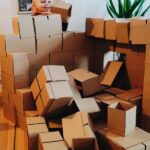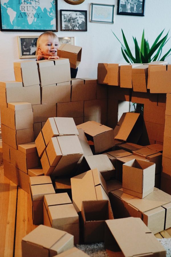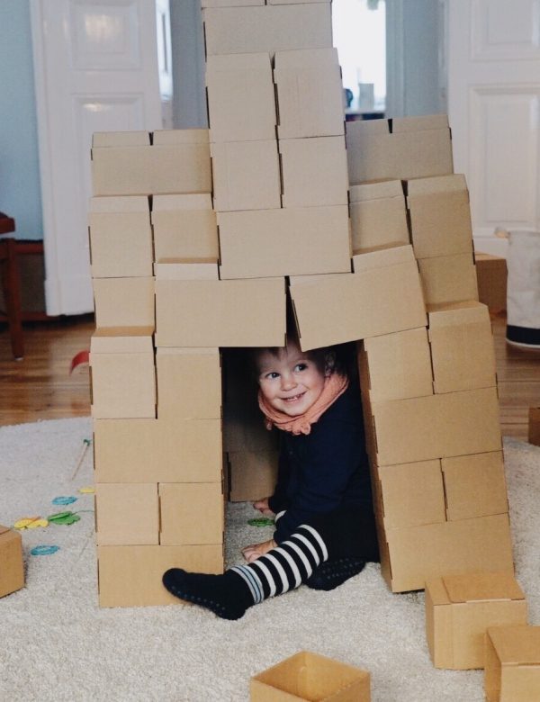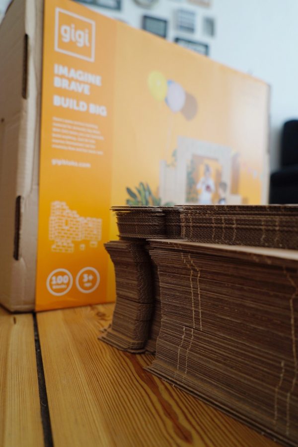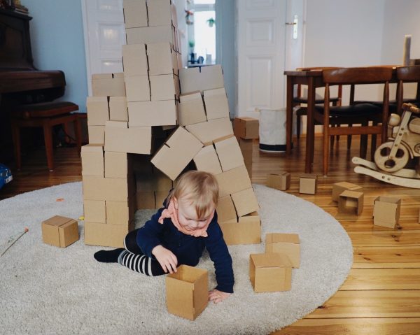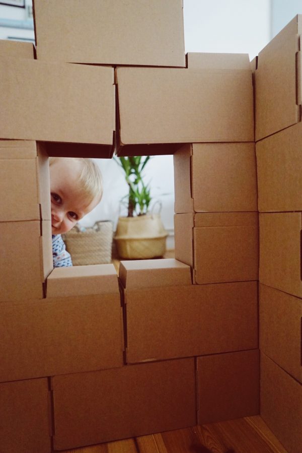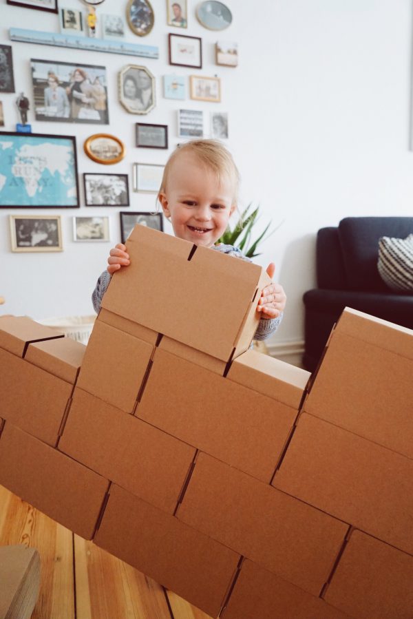 Zugegeben, wenn das Kind beim Essen es schafft mehr Jogurt auf den Boden, als in den Mund zu bringen, dann könnte es sein, dass Sie mit GIGI Bloks zu Beginn einen Haufen Eigenarbeit haben. GIGI Bloks sind übergroße Bauklötze aus Pappe, die vor dem großen Bauspaß erst einmal zusammengefaltet werden müssen. Ich sag nicht, dass das schlecht ist. Ich mach sowas gerne und ab der Hälfte der Faltaktion konnte ich den Mann geschickt mit einem „Wer schafft es den Stein schneller zusammenzubauen?“ mit einspannen. Am Ende ging dann doch alles ganz schnell, und sind alle Steine gefaltet, sind der Kreativität keine Grenzen gesetzt. Zusammenstecken, ein Haus hochziehen, upps – es stürzt ein und man beginnt wieder von vorne. Irgendwie waren wir alle so im GIGI-Wahn, dass der Nachmittag wie im Flug verging. Ein Nachteil ist vielleicht der Platzaufwand und das es schwer wird Junior zu erklären, dass die Kartonkästchen kaputtgehen, wenn man draufsteigt. Also haben wir sie jetzt brav wieder auseinander gefaltet, warten einfach noch ein paar Jahre und holen dann das Ass aus dem Keller 🙂