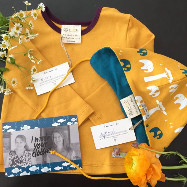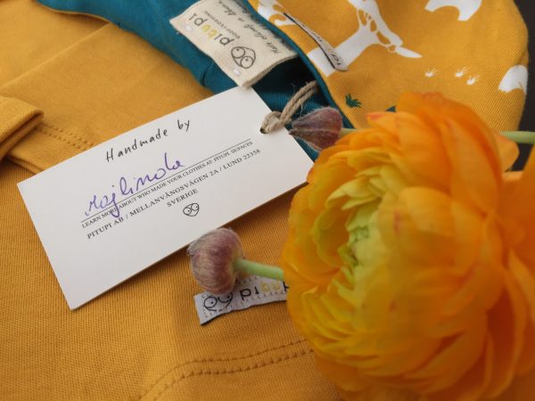 Seit ich für Junior selbst Klamotten nähe, ist mir bewusst wieviel Arbeit und Zeit darin steckt. Pitupi möchte mit seinem Konzept wieder eine Beziehung zwischen den Näherinnen und den Kunden aufbauen. Die Ideen für die Designs entstehen vor allem in Schweden, weshalb die aktuellen Stücke sehr an den schwedischen „Midsommar“ angelehnt sind. Fair Trade steht an oberster Stelle, dafür wurde sogar eine eigene Produktionsstätte in Albanien aufgebaut. Jedes Kleidungsstück ist handgefertigt, aus Biobaumwolle und kommt mit einer kleinen Karte nach Hause, mit Bild und Grüßen von der Schneiderin. Das bringt ein ganz neues und schönes Gefühl mit sich, wenn man sich vorstellt, dass Majlinda und Entela das Shirt und die Mütze für den Dreikäsehoch genäht haben.