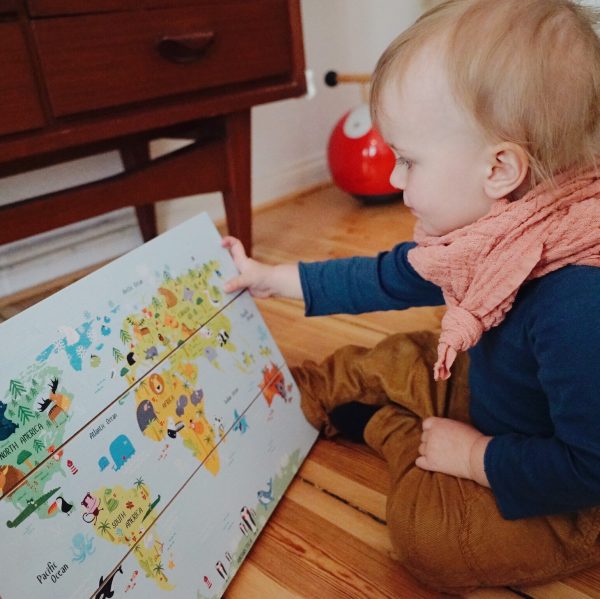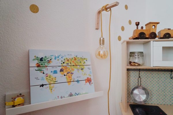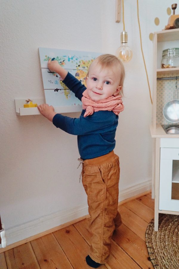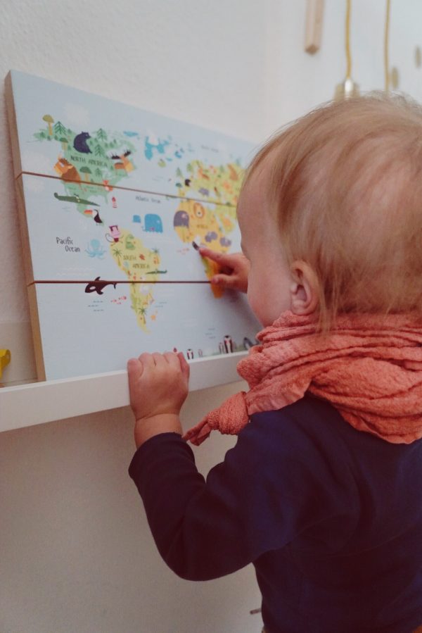 „Wo ist der Bär?“ Auch wenn Junior noch nicht weiß, wie groß unsere Welt ist, so bekommt er zumindest langsam das Verständnis dafür, dass es Bären oben links und oben rechts gibt. Außerdem oben mittig in weiß und in ganz kleiner, grauer Form unten rechts. Die Weltkarte von Weltkarten.de ist auf Holzbalken gedruckt und ersetzt im Moment das Tierbuch. Selten steht die Weltkarte an ihrem Ort (wir haben sie noch nicht aufgehängt), weil Junior am liebsten mit ihr in der Hand durch die Wohnung läuft und „Ba, Ba“ für Bär ruft. Die Weltkarten gibt es in verschiedensten Designs (nicht nur fürs Kinderzimmer) auf alle Arten von Oberflächen. Uns haben es die Holzplanken angetan, das sieht einfach mal anders und sehr viel hochwertiger aus, als ein ’normales‘ Bild. Bei FotoAufHolz.de kann man übrigens auch sein eigenes Foto auf Holz drucken lassen – das wäre vielleicht auch mal was?!
