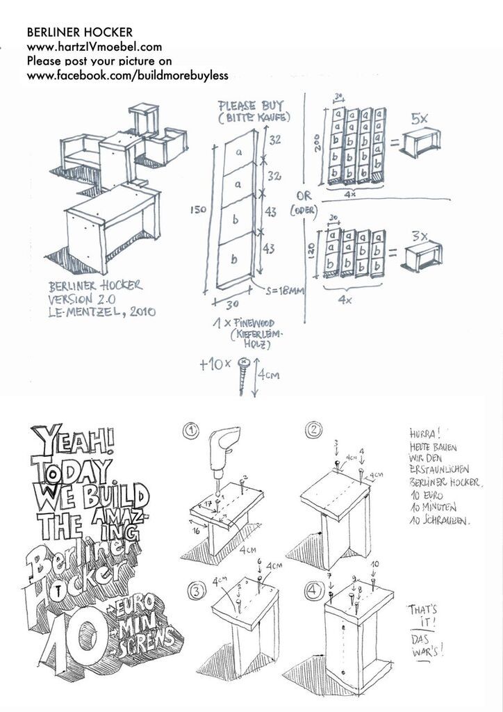 Ich hatte den Berliner Hocker bereits hier vorgestellt, muss ihn aber noch mal erwähnen! 10 Schrauben, 10 Minuten, 10 € und auch im neuen Kinderzimmer das ideale Kindermöbelstück. Das Allroundtalent ist Teil der Reihe Hartz Vier Möbel. Die Anleitung zum Ausdrucken gibt es hier.