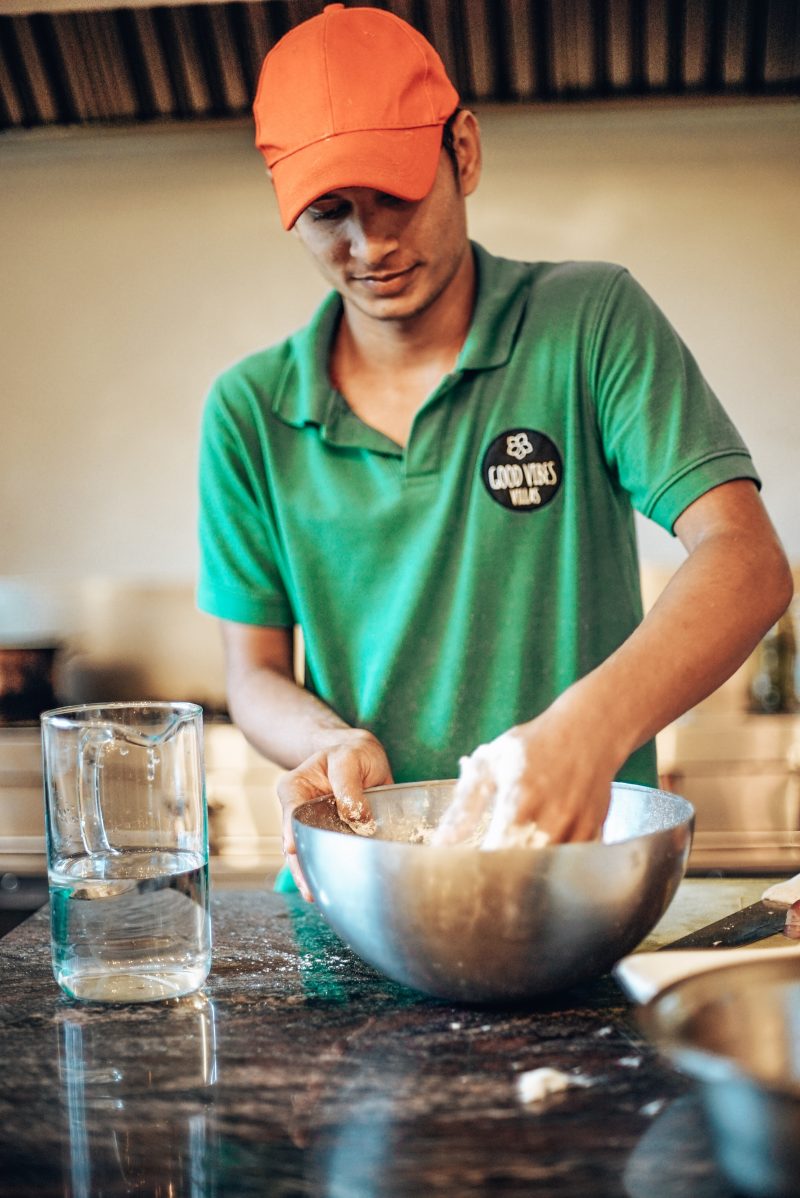 Wir laufen ins Restaurant, wo wir uns mit Bubbhi verabredet haben. Er sitzt auf einem der Stühle und spielt auf seinem Handy. Bubbhi ist 19 Jahre alt und macht gerade seine Ausbildung zum Koch in Kandy. Über Ostern vertritt er einen Freund seines Lehrers und arbeitet in den Good Vibes Villas als Koch. Noch ein Jahr muss er zur Schule gehen, dann ist er fertig. Seine drei Schwestern und zwei Brüder sind mächtig stolz auf ihn.