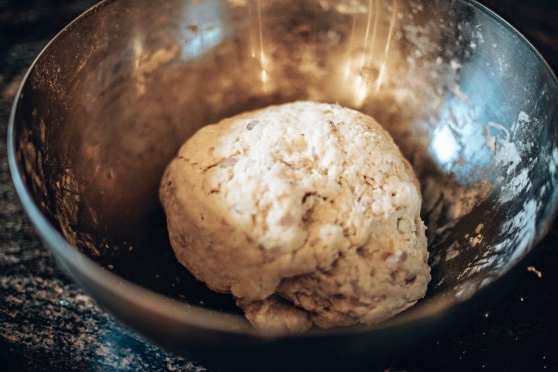 Zu einem festen Teig kneten und ggf. etwas mehr Mehl oder Wasser hinzugeben.