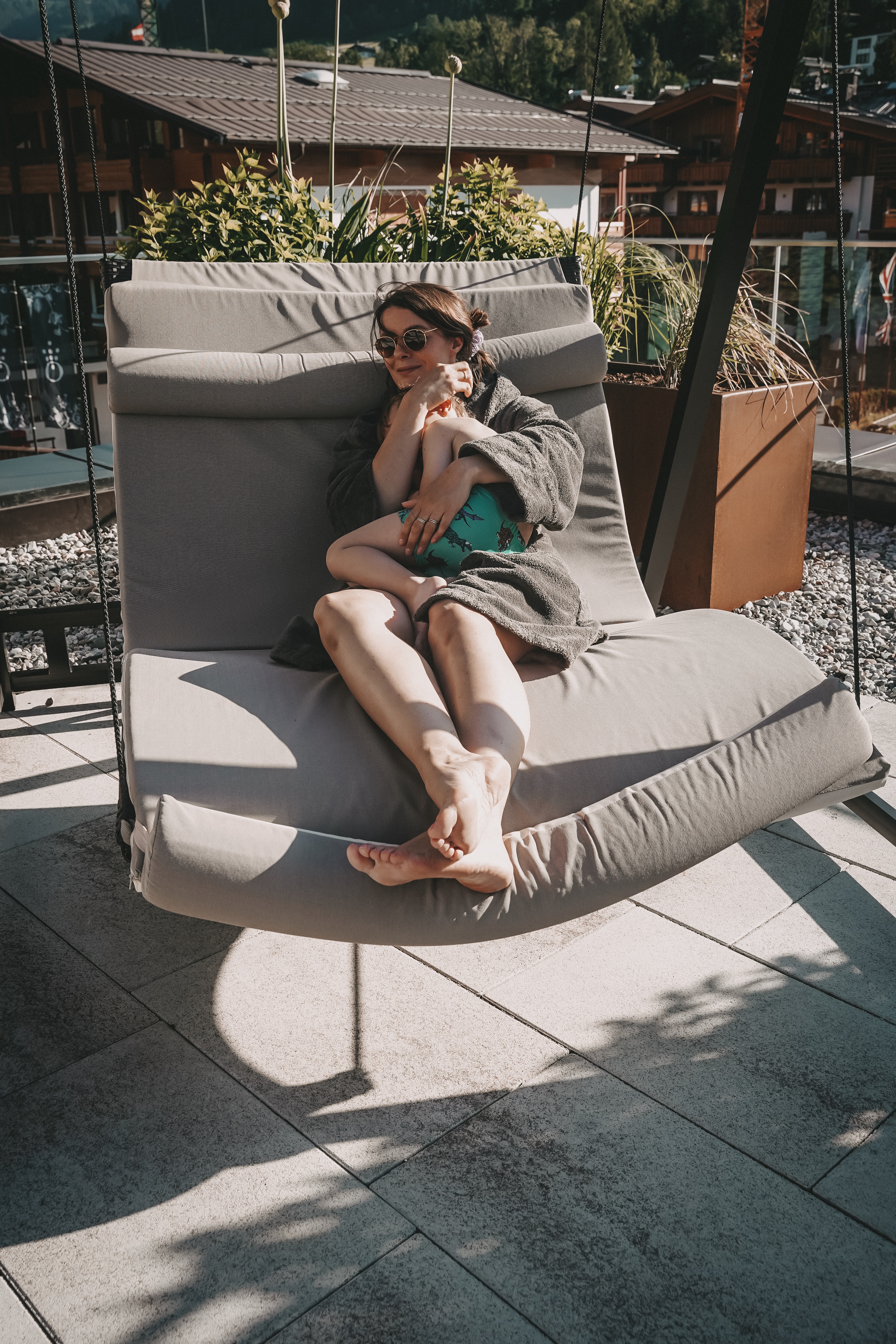 Somit steht einer entspannten Nacht in der Family-Suite, mit großem Doppelbett und zwei Einzelbetten im Nebenraum, mit Schiebetür, nichts mehr im Weg. Viel Holz, Stein und Alpin-Chic ziehen sich durch das ganze Haus. Das Highlight ist der SPA Bereich im Obergeschoss. Die perfekte Kulisse fürs Naturkino bietet der Infinitypool inkl. Whirlpool. Der Adults-Only-Bereich darf ab 17 Uhr auch mit der ganzen Familie genutzt werden. Wer davor schon plantschen will, der nutzt den etwas kleineren Family SPA im Untergeschoss.