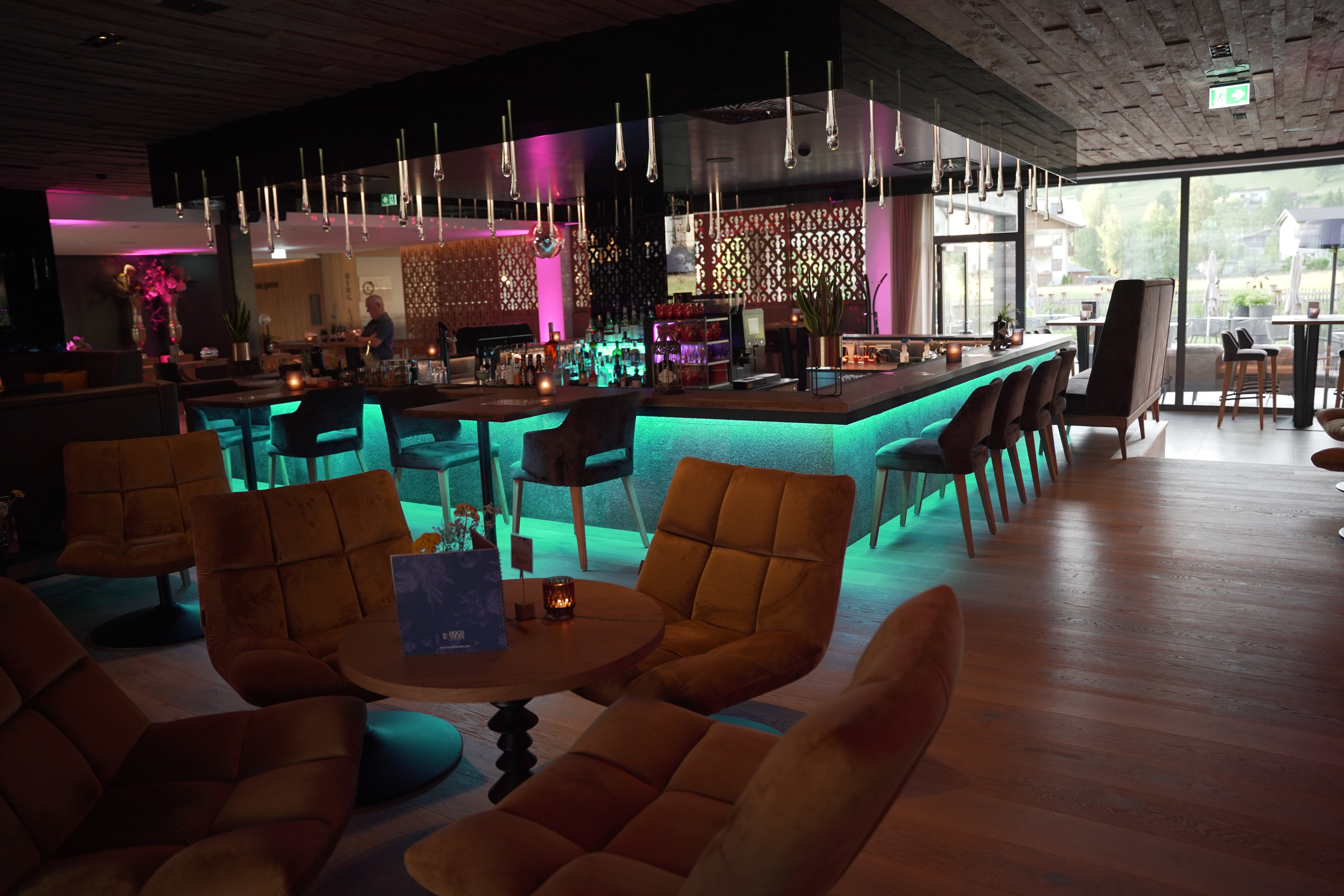 Nach einer herzlichen Begrüßung durch die Gastgeberfamilie, im wunderschönen Eingangsbereich, mit lodernden Flammen und einer zum Verweilen einladenden Bar, bleibt einem spätestens beim Blick auf die Terrasse „with a view“, mit vielen Sitzmöglichkeiten und einem Spielplatz, gänzlich die Sprache weg.