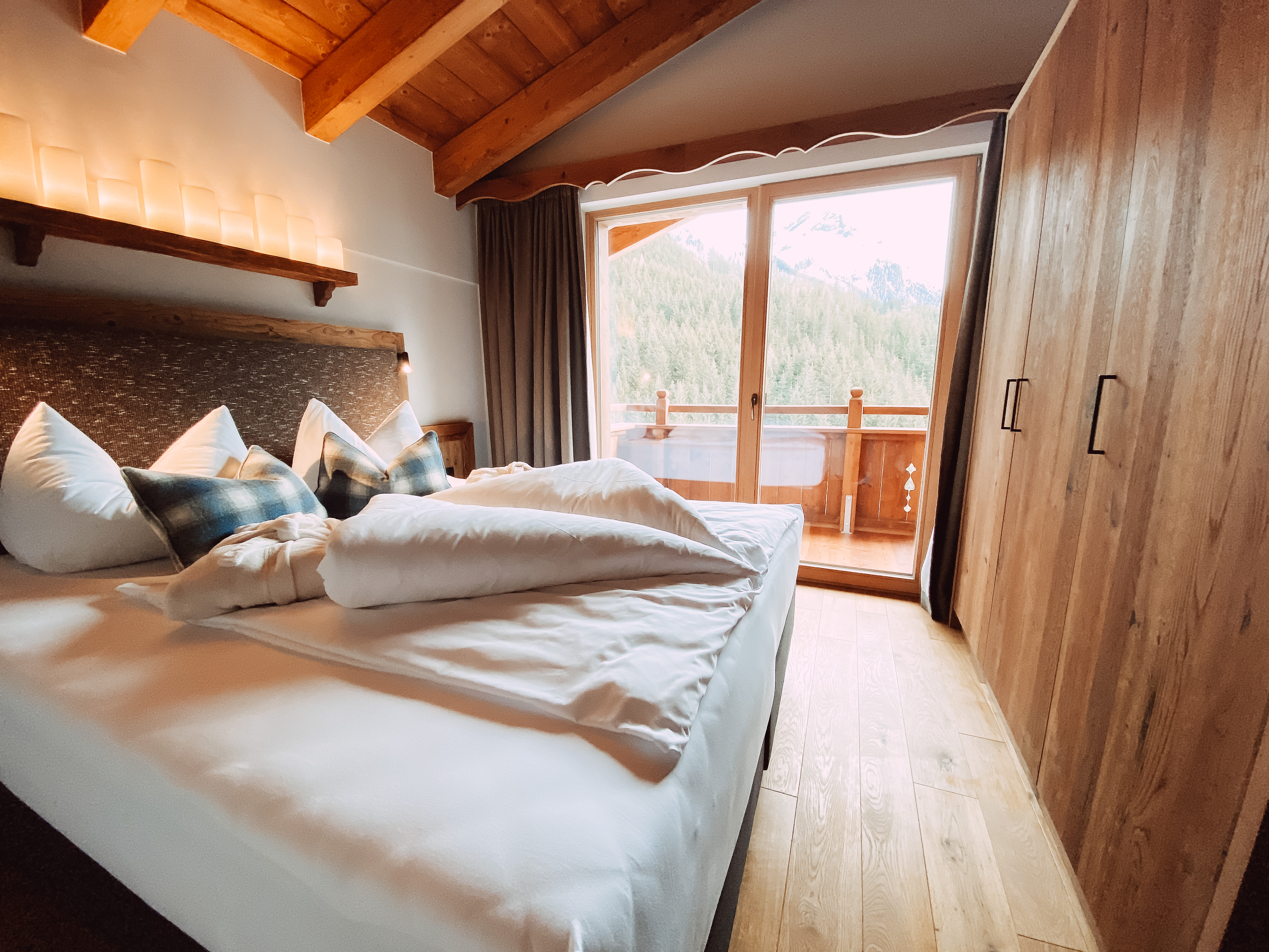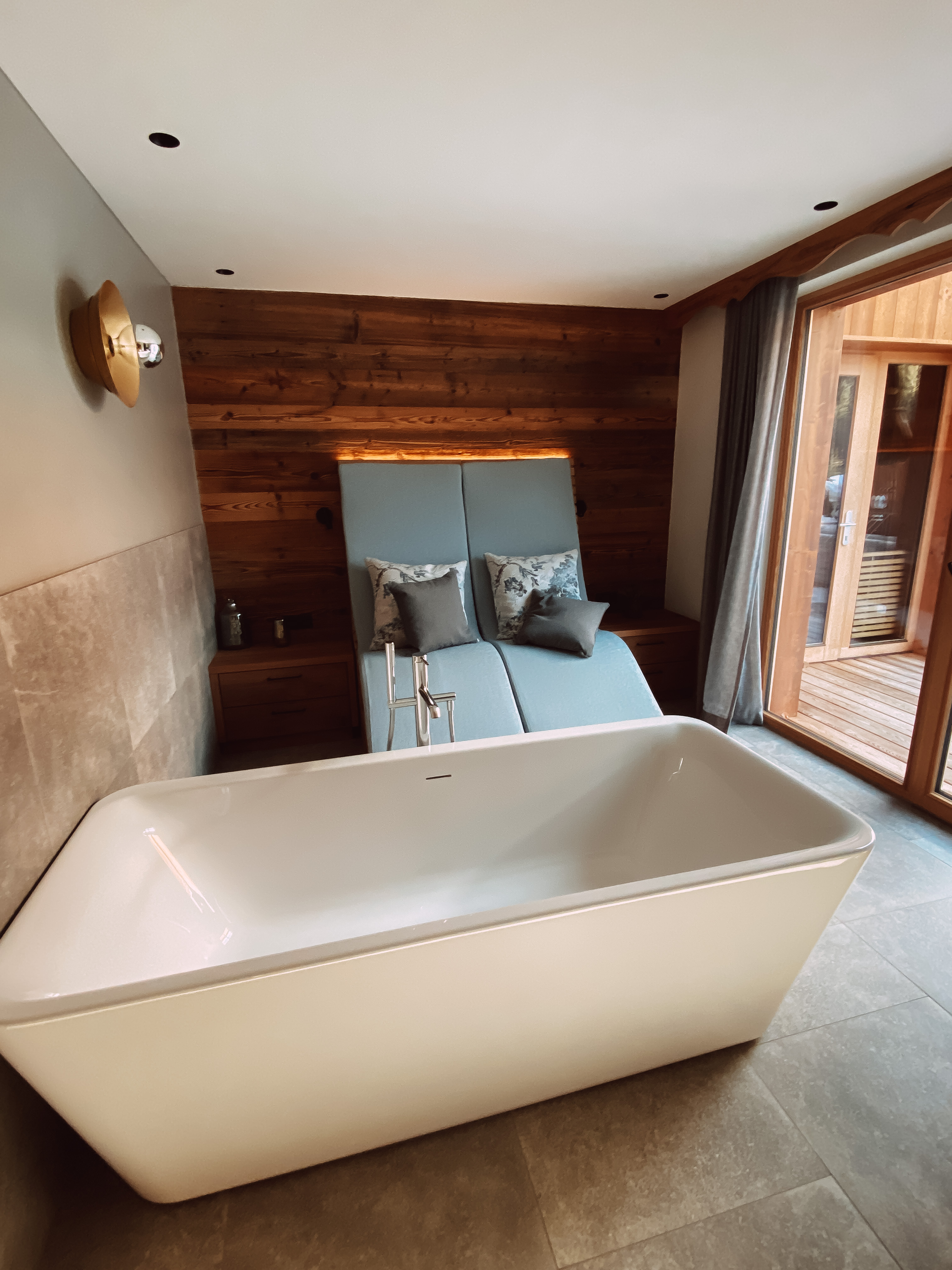 Ein eigenes Chalet für die ganze Familie. Bis zu 8 Personen können hier auf 125qm wohnen und schlafen. Kamin, eigene Sauna, Spa Bereich und eine Natursteinwanne auf der Terrasse.