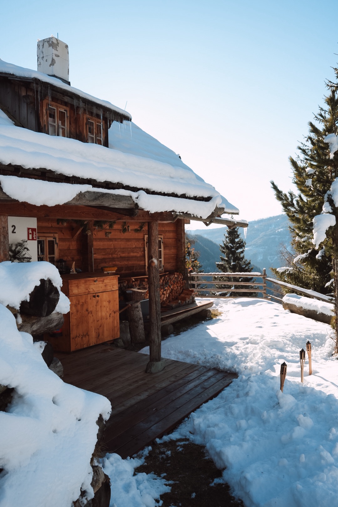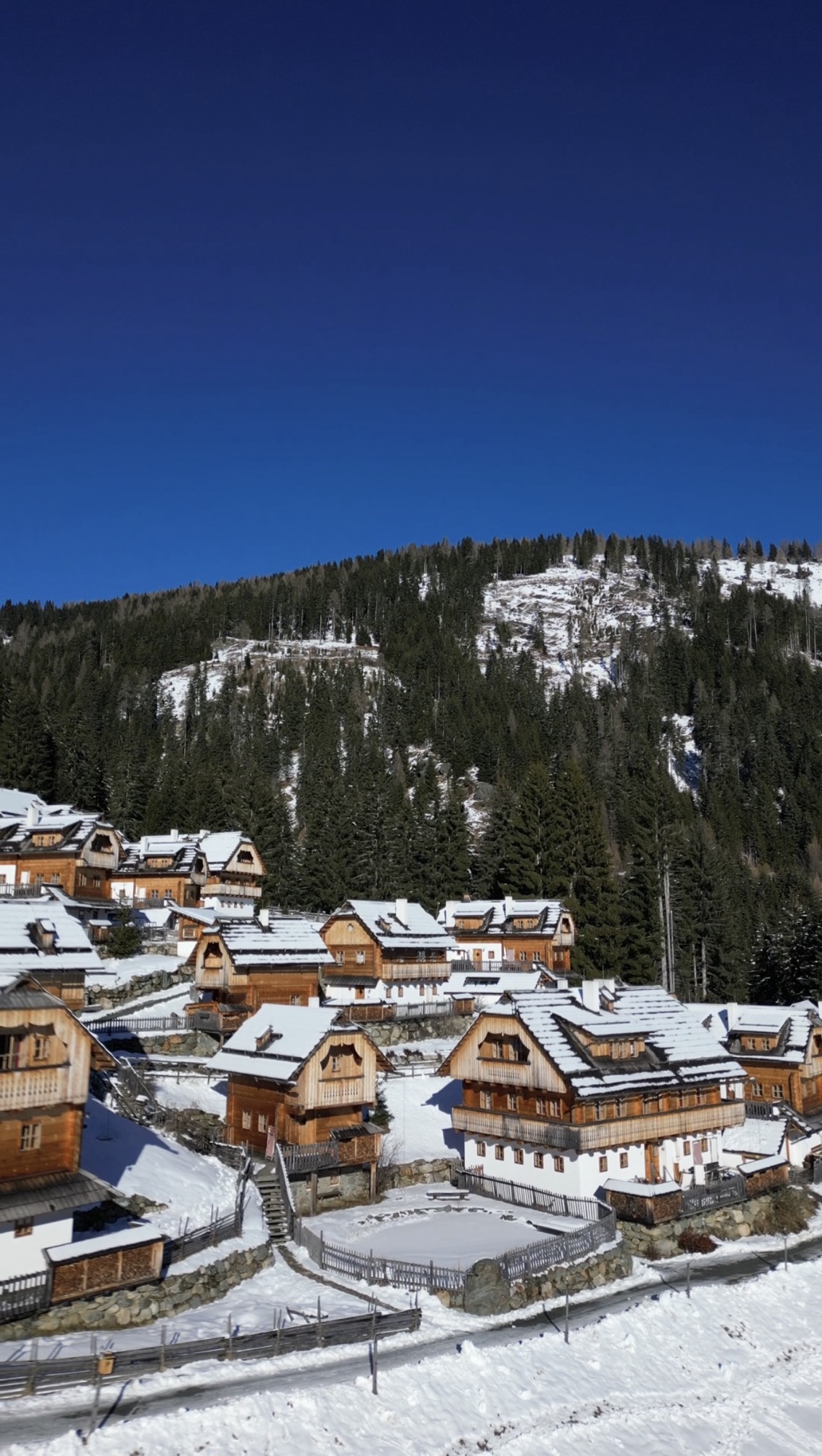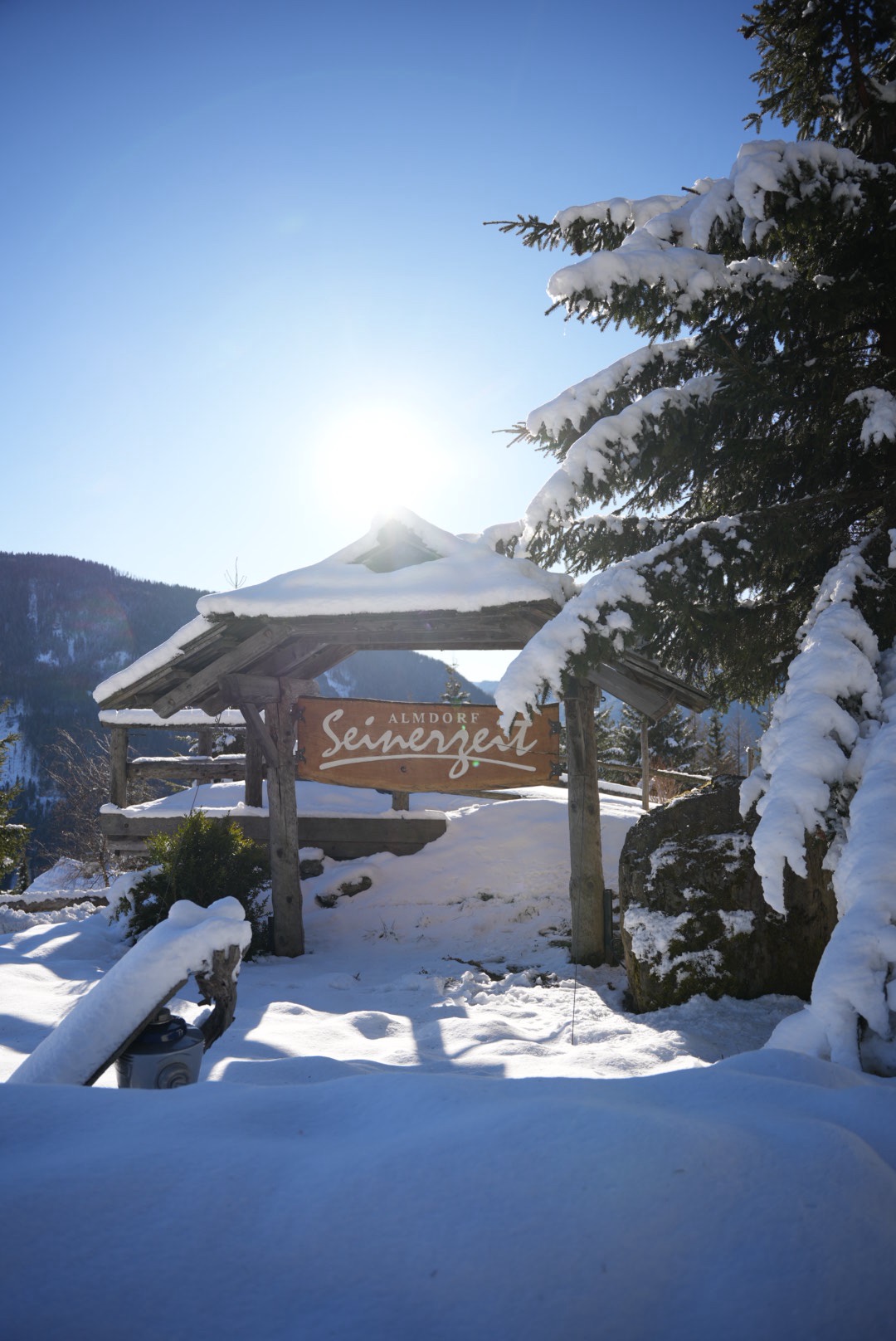 Wir waren im Almdorf Seinerzeit. Zwei Almdörfer nebeneinander, 50 Chalets und urtümliche Hütten. Das ältere Fellacher mit urigen Hütten, atemberaubender Kulisse und Gemütlichkeit pur und das neuere Kleeangerle mit authentischer Bauweise und mehr Platz für größere Gruppen. Jede Hütte hat ihren eigenen Hot Tub und zum Teil eine eigene Sauna. Es gibt zwei Wirtshäuser und Hüttenservice.